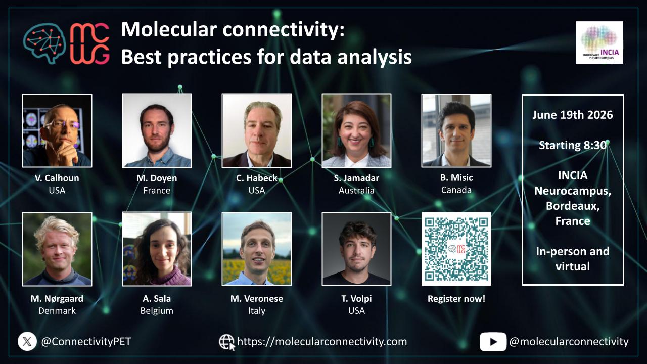 The symposium will be held on June 19th 2026 at Bordeaux (France), at Neurocampus facilities immediately following the Organization for Human Brain Mapping (OHBM) annual meeting. It builds on the success of our previous events: a satellite meeting held during the Brain & Brain PET conference in Glasgow in May 2022 (374 participants – 50 in person and >1600 views on Youtube), and a first dedicated symposium held in Munich in May 2024 (242 participants – 60 in person). Both events were very successful, led to the formation of our Molecular Connectivity Working Group which holds regular online seminars, and has produced influential papers [1][2].